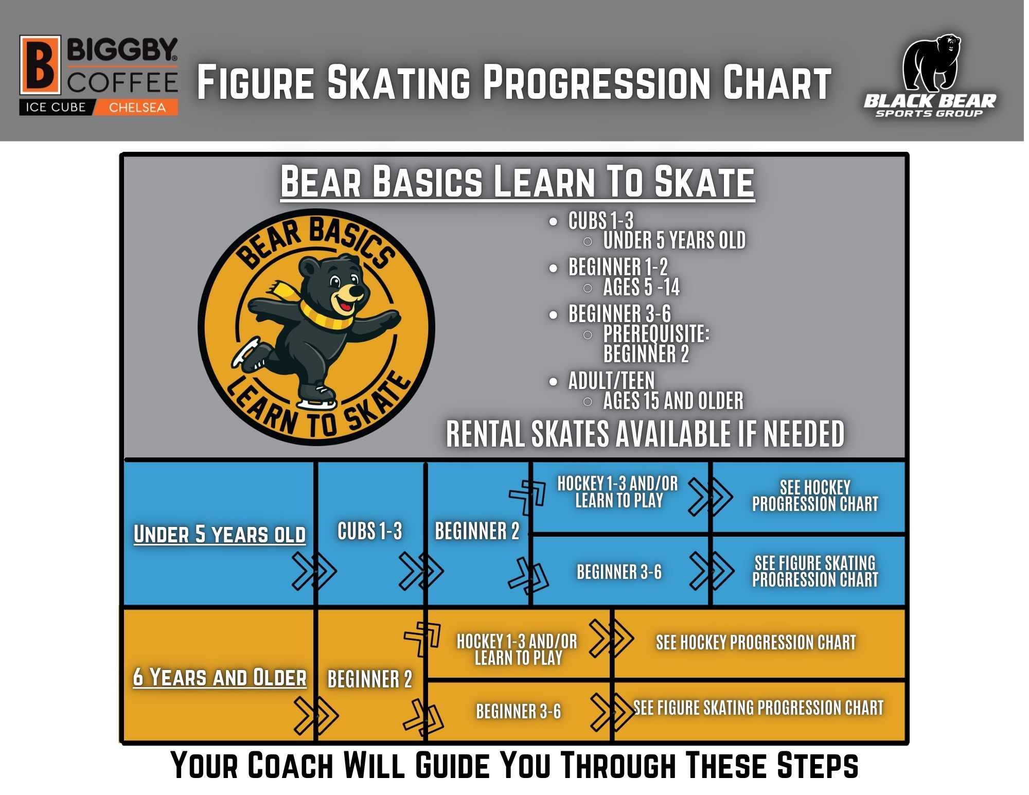 From your tiniest tot to your rising star, this is where it all begins. Our arena follows the Bear Basics curriculum designed exclusively for Black Bear arenas. This program offers quality instruction with comprehensive skill levels for skaters wanting to play hockey, figure skate, or to simply skate recreationally with friends! Our professional instructors will conduct classes in a positive atmosphere, making learning to skate a fun experience for skaters of all ages!